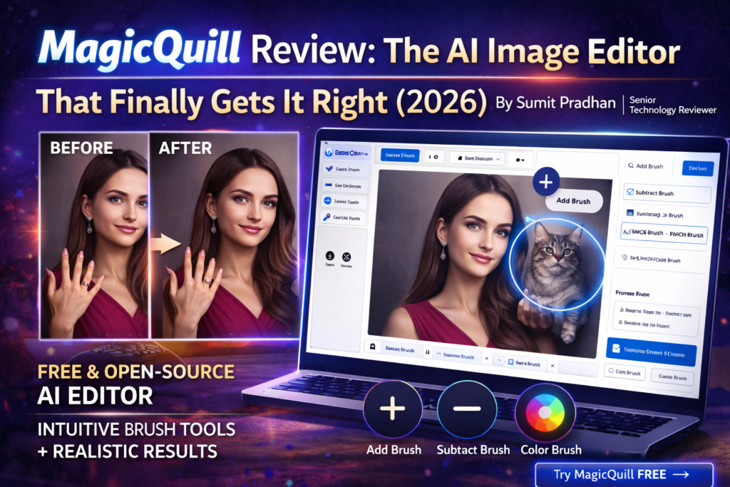 👋 About the Reviewer: This review was written by Sumit Pradhan, a technology reviewer specializing in AI tools and creative software. With over a decade of experience testing image editors—from Photoshop’s early AI features to the latest generative tools—Sumit brings both technical expertise and real-world perspective to product reviews. All testing was conducted independently using publicly available versions of MagicQuill between January and February 2026.